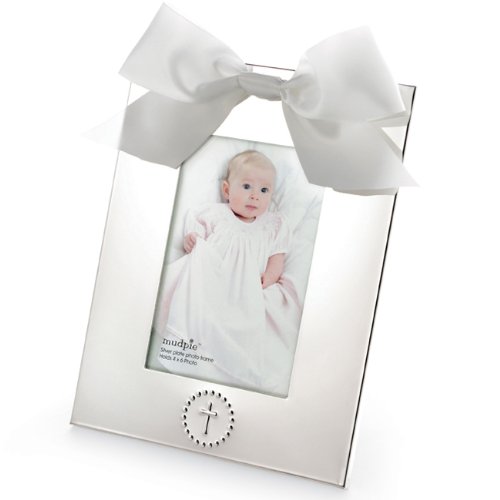 Mark your baby's landmark moments by displaying a cherished photo in this elegant silverplate cross frame by Mud Pie which includes a beautiful white satin bow and embossed cross detail. Holds one 4" x 6" photo. Easel back and comes in a gift box.